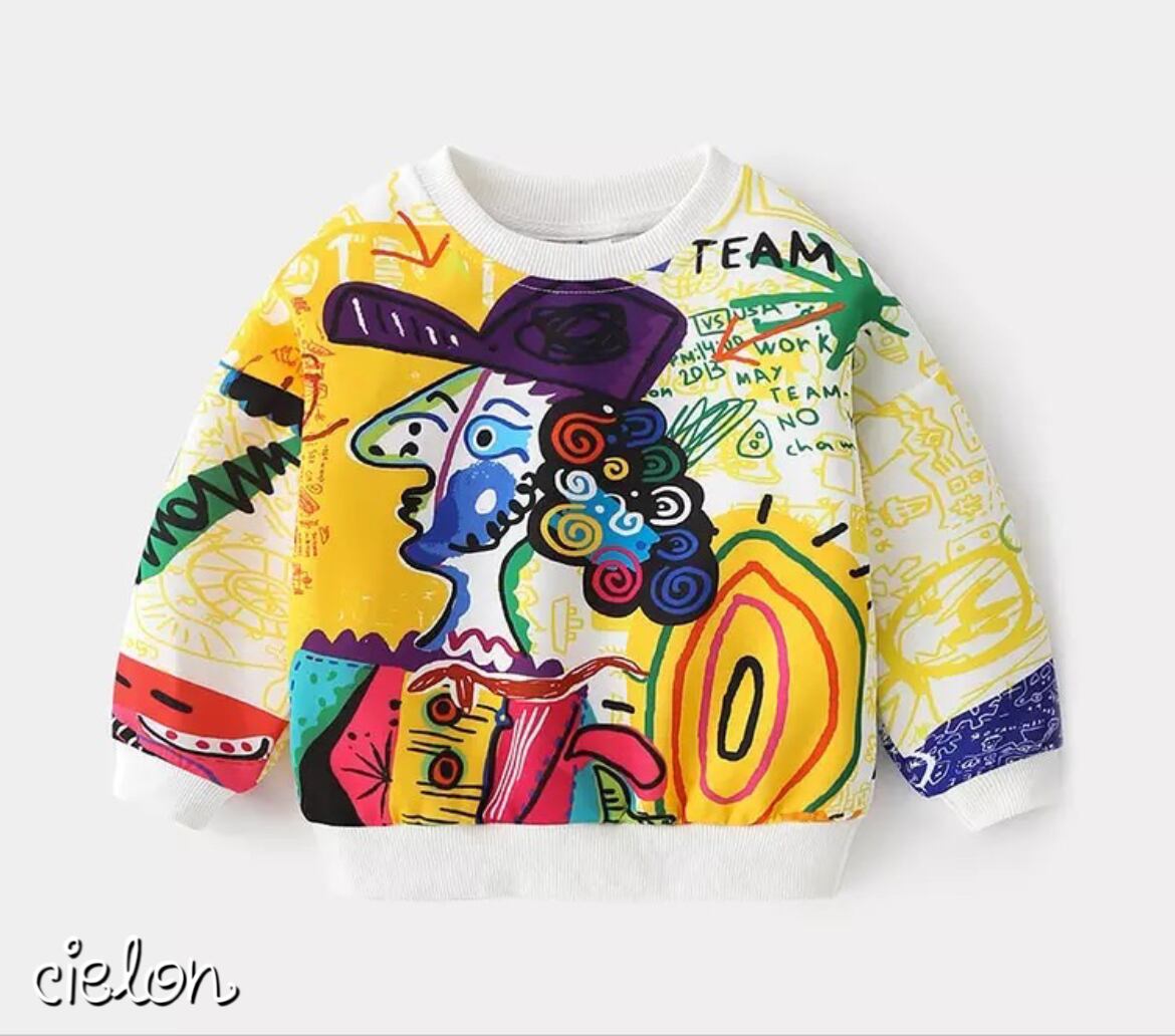 ☆NEWデザインファッショントレーナー ○絵画みたいな派手なプリントがオシャレさん♡ ✔️size: 100〜140 ✔️color: one color タグサイズ 着丈 バスト*2 袖丈 110 44 41 33 120 47 43 36 130 50 45 39 140 53 47 42